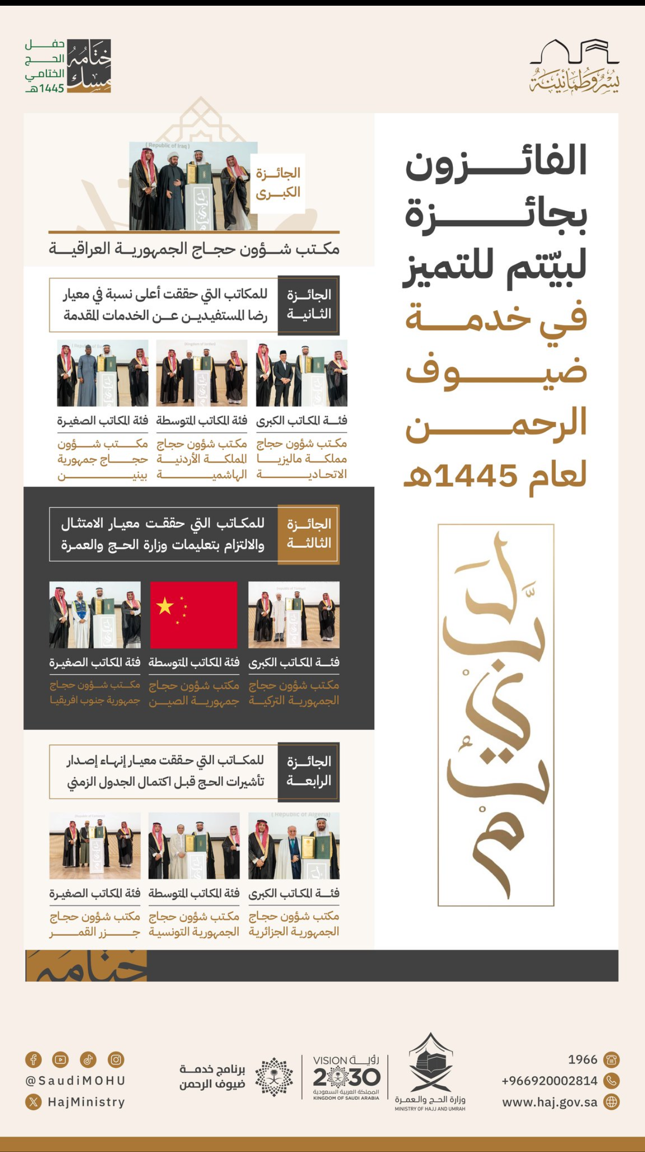 یہ سیکشن وزارت کی جانب سے اداروں اور افراد کو کارکردگی میں بہترین کارکردگی کے اعتراف، شاندار عملی اقدامات کی حوصلہ افزائی، اور خدمت ضیوف الرحمن کے نظام میں ترقی اور جدت کے اقدامات کی حمایت کے لیے دی جانے والی انعامات کو پیش کرتا ہے۔"
